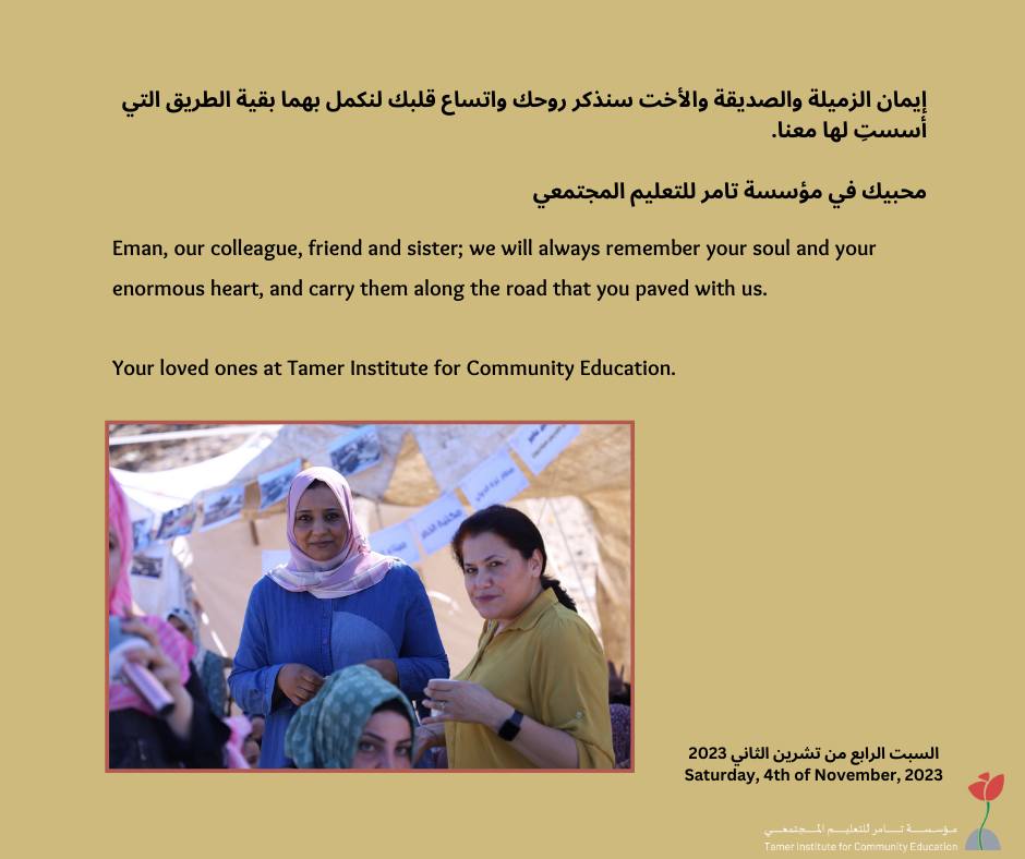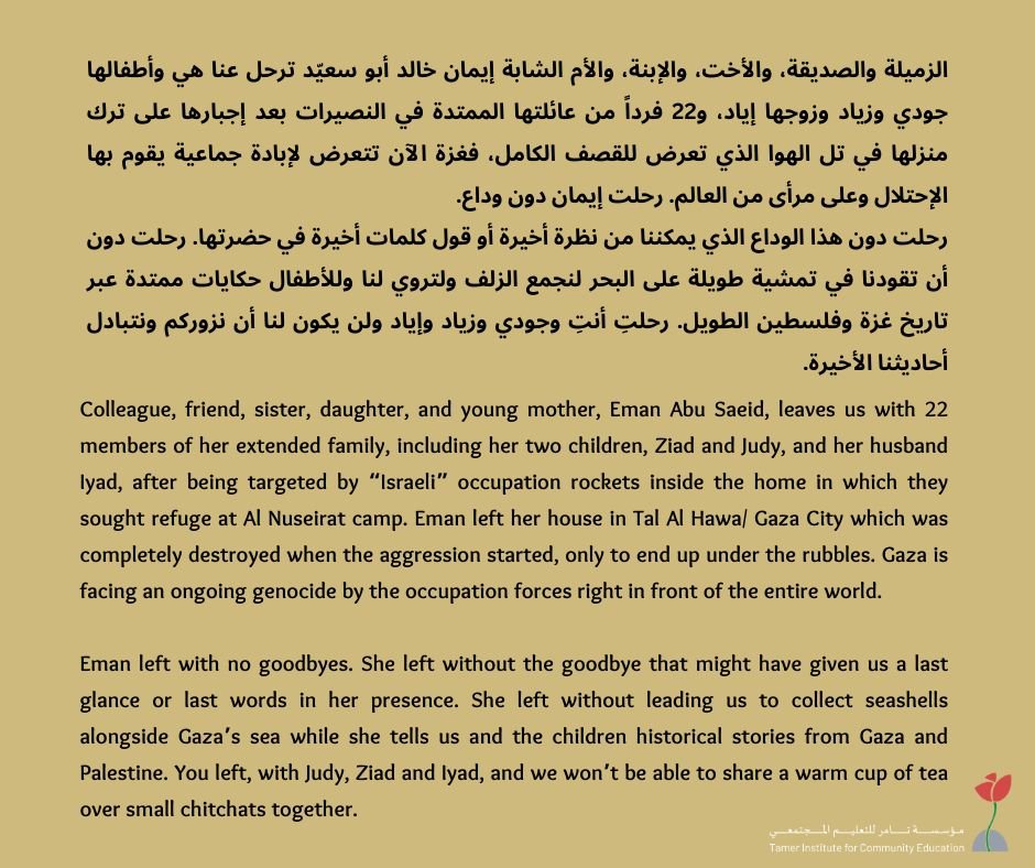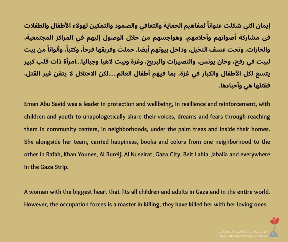 Eman is a woman with the biggest heart that fits all children and adults in Gaza and in the entire world. However, the occupation forces is a master in killing, they have killed her with her loving ones.