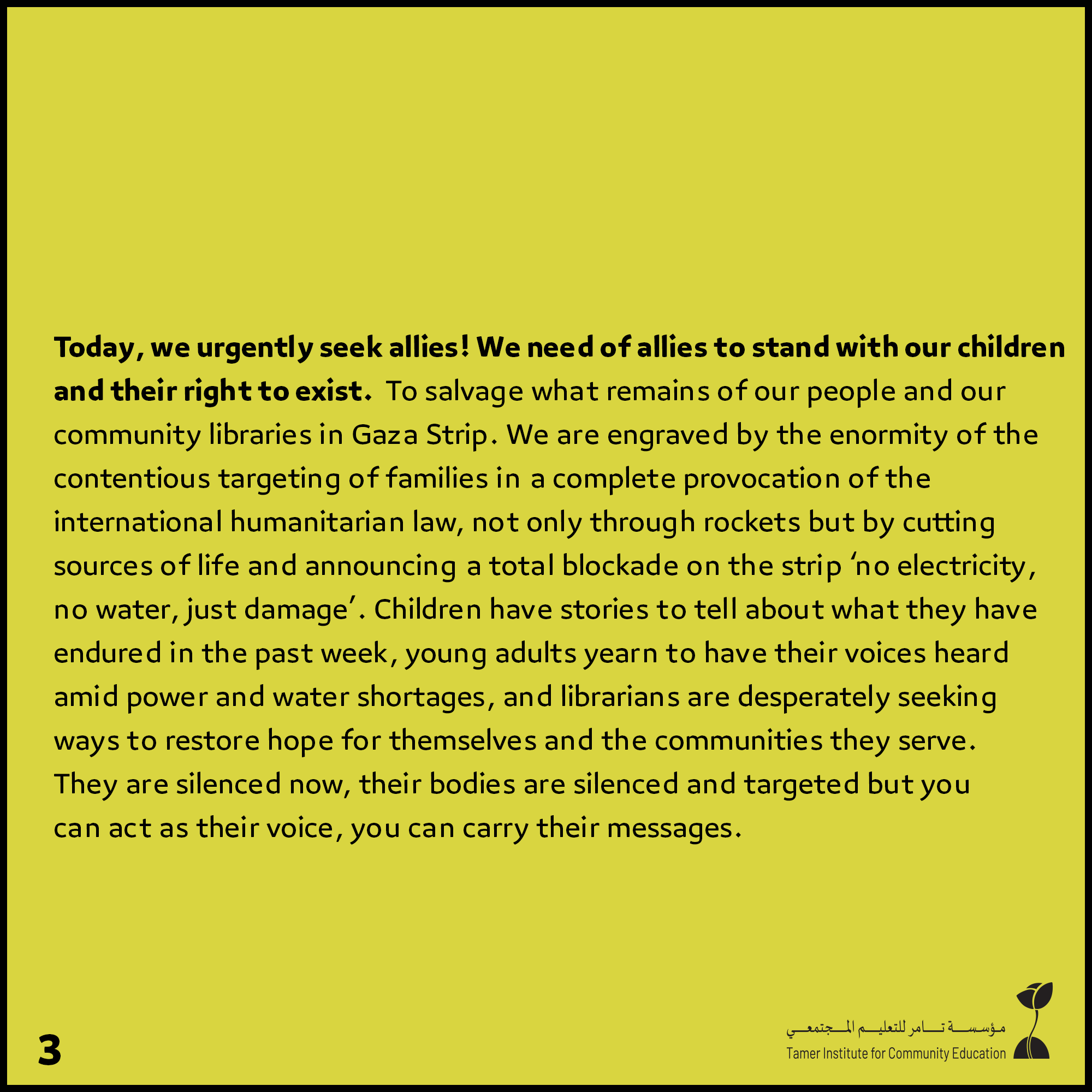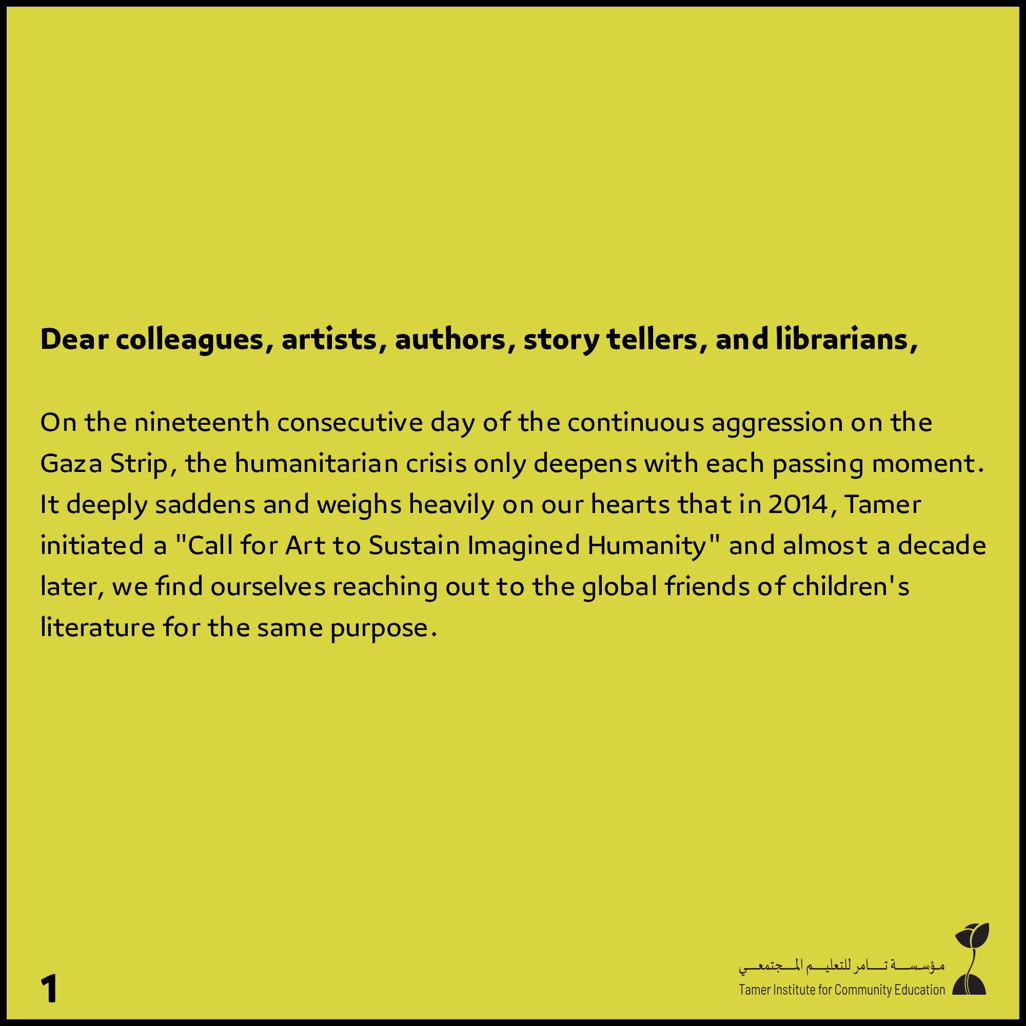 We urge every individual who had any interaction with Palestinian children through books, storytelling activities, workshops, visits, or even virtual meetings to share with the world their experiences of meeting with Palestinian children. Our role as cultural and art institutes around the wolrd, is manifested in providing safe and free spaces and ultimately lives for our children and librarians. Our commitment to this goal is a result of our common belief in the only victory that truly matters: the victory of our shared humanity, a reality that cannot be compromised.